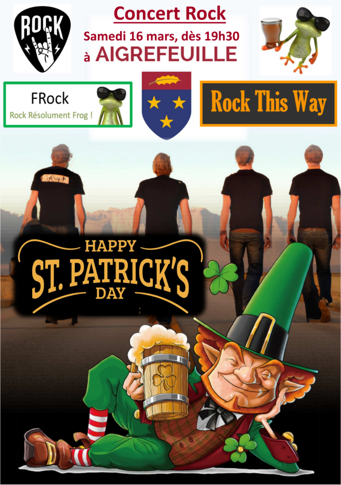 Le samedi 16 mars, à l’occasion de la St Patrick, les groupes FRock et Rock This Way se produiront à Aigrefeuille (près de Saint-Orens et Quint-Fonsegrives).